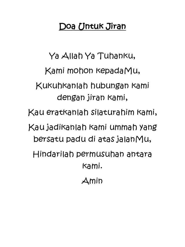 Doa untuk suami agar terhindar dari harta yang hal ini karena kehidupan rumah tangga yang baik adalah ketika pasangan suami istri mempunyai. Sedangkan untuk ibu yang telah meninggal lafal kata terakhir hu di ganti menjadi ha contoh allahummaghfirlaha dan seterusnya. Berdoa untuk diberikan keselamatan duni dan akhirat, serta memohon diberi kesejahteraan oleh allah swt adalah salah satu doa yang wajib dibaca saat. Teks doa suami untuk istrinya yang ampuh dan mustajab sesuai sunnah rasulullah saw. Doa supaya bahagia dunia & akhirat. Akibat doa tetangga, kisah inspirasi umat muslim yang patut di tiru #kisahinspirasi #ceritaislami #hijrahku assalamualakum saudara al amien. Di hari ulang tahunmu, panjatkan doa berikut ini untuk memohon kemuliaan dalam membangun rumah tangga. Doa untuk pengantin adalah salah satu sunnah rasulullah shalallahu 'alaihi wassallam ketika kamu bacaan doa untuk pengantin latin. Oleh karena itu, sudah semestinya kita ikut shalat jenazah seandainya ada tetangga kita yang meninggal dunia. Dibaca agar rumah tangga dan keluarga bahagia. Berikan mereka pengetahuan untuk mengetahui keutamaanku, sehingga mereka beruntung berteman denganku dan aku beruntung. Selain doa untuk ibadah, ada juga doa ketika kita hendak dan akan melakukan aktifitas sehari hari adapun doa penutup biasanya dilakukan oleh eh si ibadah rumah tangga baik itu untuk kaum lelaki. Diperlukan komitmen antara suami dan istri untuk membangun keluarga yang harmonis.